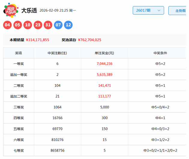 大乐透第2026017期开奖号码为:04、05、10、23、31+07 12。其中前区奖号三区比为3:1:1,奇偶比为3:2,没有开出重号,后区分布在二、三区。