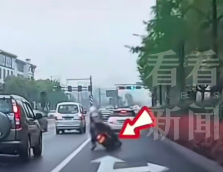 一辆摩托车因为道路标线湿滑而发生侧翻。相关报道视频截图