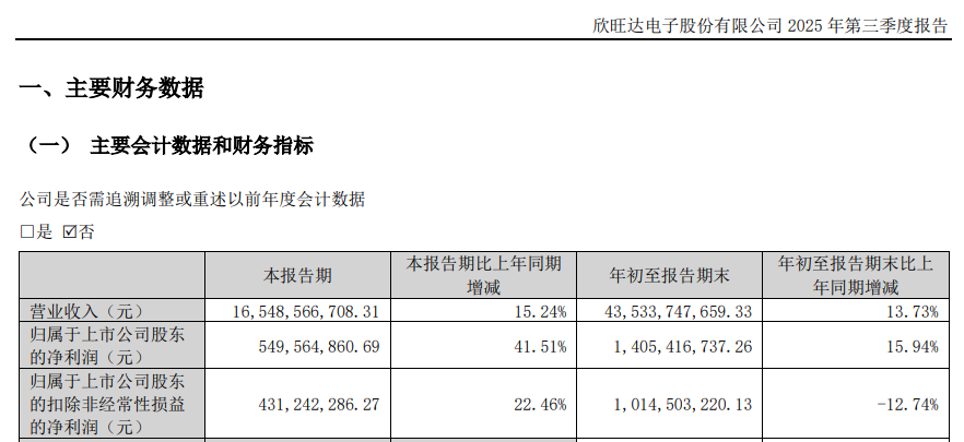 {jz:field.toptypename/}2025年前三季度,欣旺达的归母净利润为14.05亿元,同比增长15.94%。