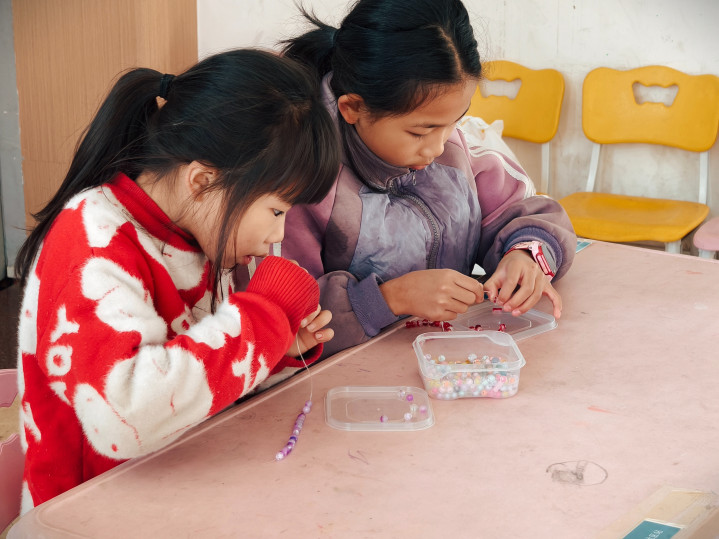 手工串珠活动同样备受孩子们喜爱,五颜六色的珠子和柔软的串珠线早已准备就绪。在志愿者的指导下,孩子们学习挑选珠子、设计图案、穿珠打结。活动现场,孩子们或专注地低头串珠,或和小伙伴交流配色心得,服务站内充满了专注而愉悦的氛围。