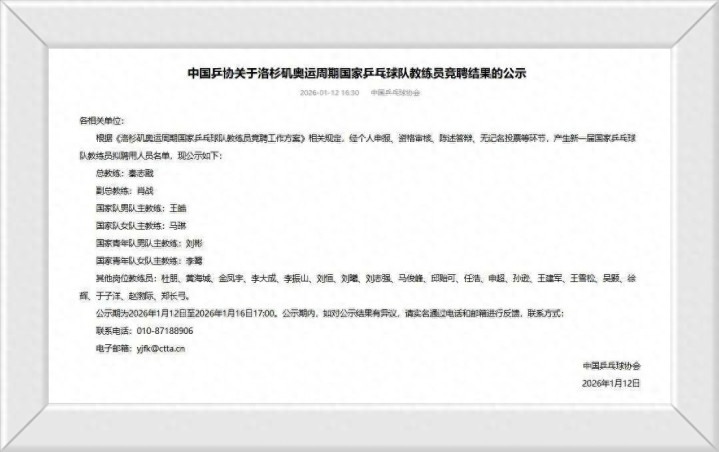 可以说,随着教练名单的宣布,洛杉矶奥运周期的“将帅”悬念正式结束,相信在足协王励勤的带领下,新一届国乒教练天团的执教下,国乒一定能够继续霸业。